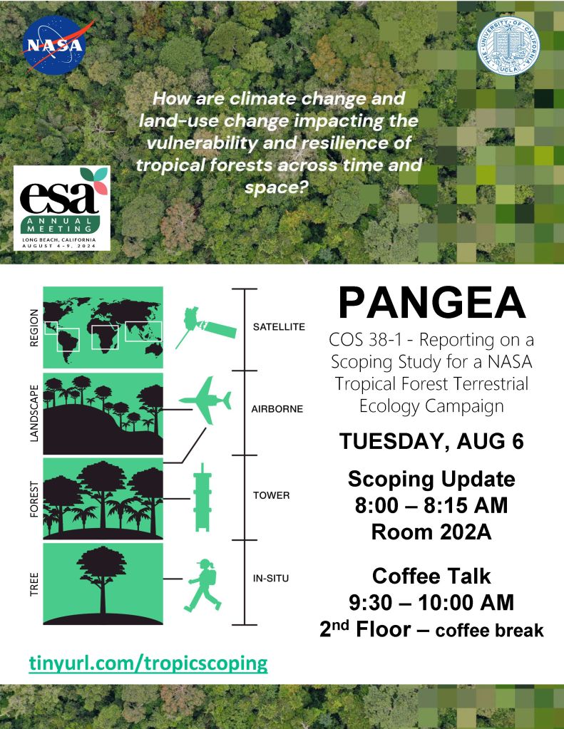 PANGEA had a strong presence at the AGU Annual Meeting in San Francisco, CA! The Town Hall event on Monday, Dec 11 was well-attended by scientists interested in learning about the scoping process, early campaign concept, and planned activities that will take place in 2024. The PANGEA Principal Investigator, Dr. Elsa Ordway, initiated the session with an introduction to the PANGEA scoping process and objectives while emphasizing the importance of input from diverse backgrounds and experiences across career stages in the early phases of PANGEA. Following the presentation, NASA Terrestrial Ecology Program Manager Hank Margolis shared insight on the motivations of NASA decadal campaigns and selection process. The Town Hall also heard from Chip Miller (NASA) and Michael Keller (USFS/USDA) about previous NASA TE Field Campaigns like the Arctic-Boreal Vulnerability Experiment (ABOVE) and the Large-scale Biosphere-Atmosphere Experiment in Amazonia (LBA). Additionally, experts from NASA Jet Propulsion Laboratory Junjie Liu and Dana Chadwick emphasized the importance of researching the variation of tropical forest responses to a changing climate and how recent advancements in aerial and space-borne technologies can scale alongside field-based measurements to elucidate complex changes in global tropical forests. Attendees were invited to share their input and remarks during a Question and Answer session at the end of the Town Hall where many were excited to recognize the potential of a large-scale pan-tropical research campaign. After the event, many interested participants came by the PANGEA “Pod” in the main exhibition hall to meet with the PANGEA team, network with other interested participants, and sign up to join a working group. Thank you for attending!
