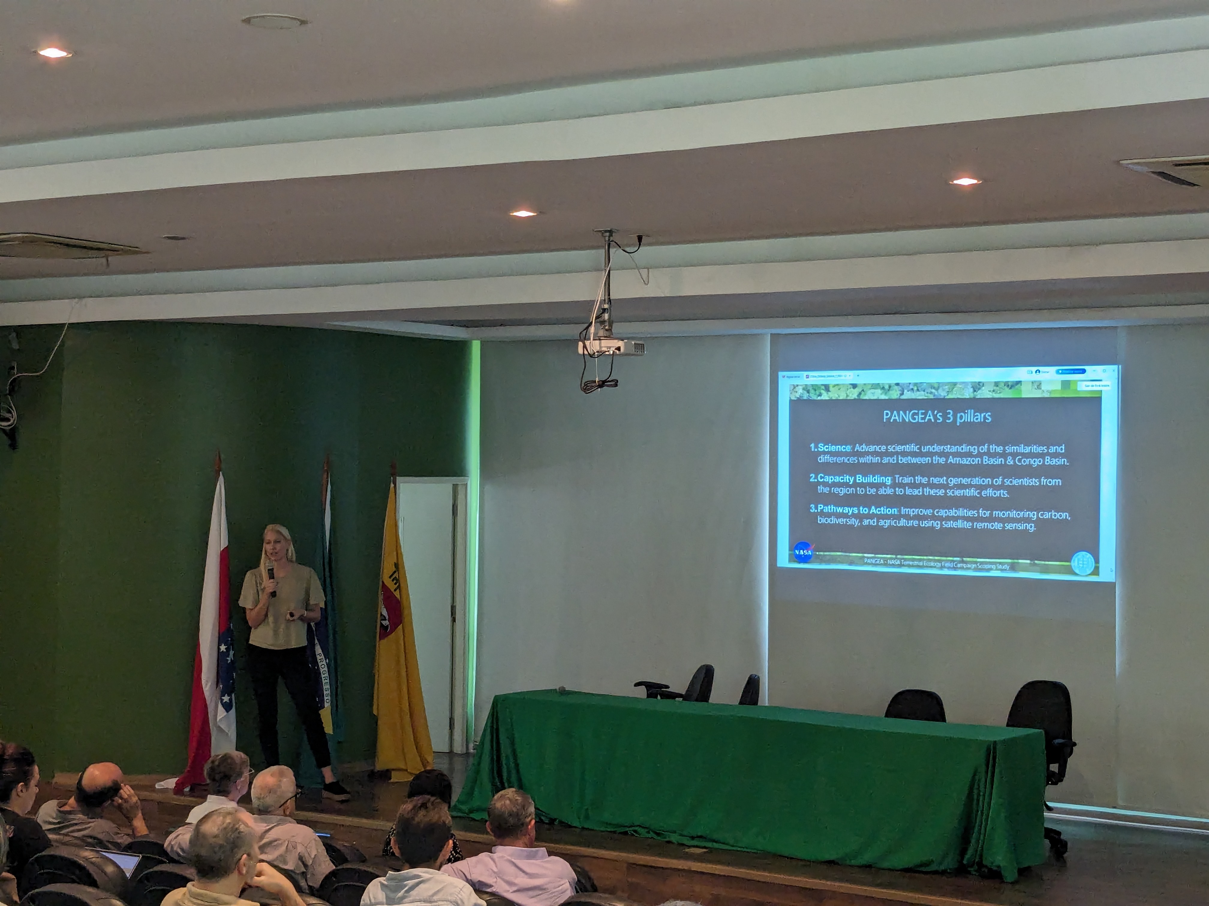 The workshop sessions presented the state of knowledge of climate and atmospheric research in the Amazon, with special sessions dedicated to engagement with local, traditional, and Indigenous communities. The Amazon forest has been susceptible to unprecedented conditions motivating a need for research on the effects of atmospheric warming and land cover/land use change. Large-scale studies can leverage emerging technologies like remote sensing and Artificial Intelligence, as well as cross-institutional collaboration with international expertise, to promote innovation in future Amazon research. The workshop highlighted the enhancement of research and fellowship exchanges between the USA and Brazil as a significant opportunity. These programs, such as faculty sabbaticals, graduate student fellowships, and research technician assistantships, provide hands-on experience, fostering research skills and cross-cultural competencies. Such exchanges build lasting partnerships, enhance research capacity, and address global challenges like climate change through collaborative efforts. Securing funding for these exchanges is crucial for developing research capacity and supporting the next generation of scholars. The PANGEA Scoping Campaign exemplifies a cooperative framework involving NASA and global partners to develop scientific and technological research capacity. PANGEA team members including Elsa Ordway, Michael Keller, Isaac Aguilar, Marcos Longo, and Mateus Nunes presented at various sessions and connected with diverse perspectives at the workshop organized by Jose Fuentes.